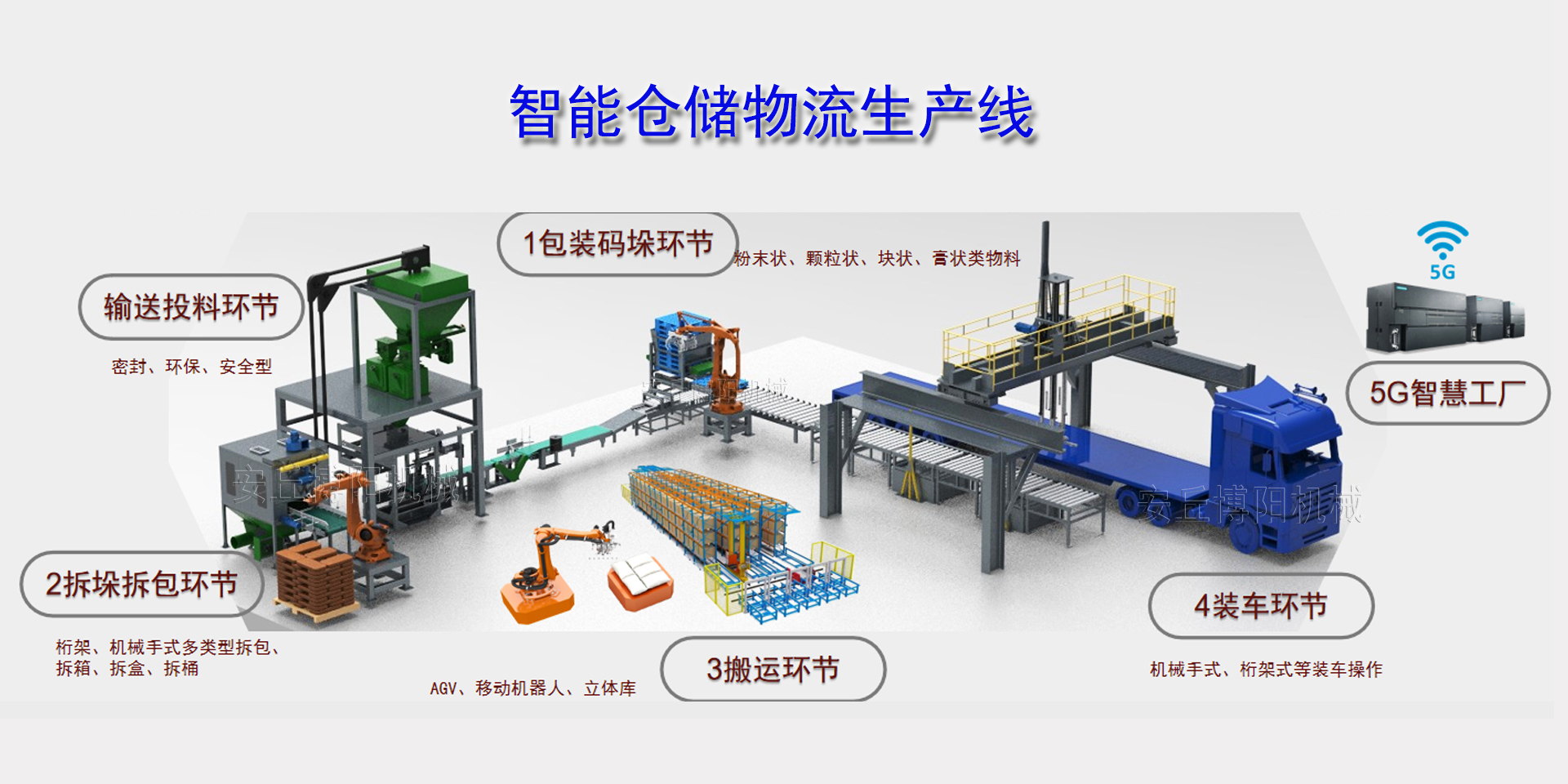 可用于仓库、车站、货场、码头等 包装、装卸、运储行业的仓储搬运物流装备的智能生产线
